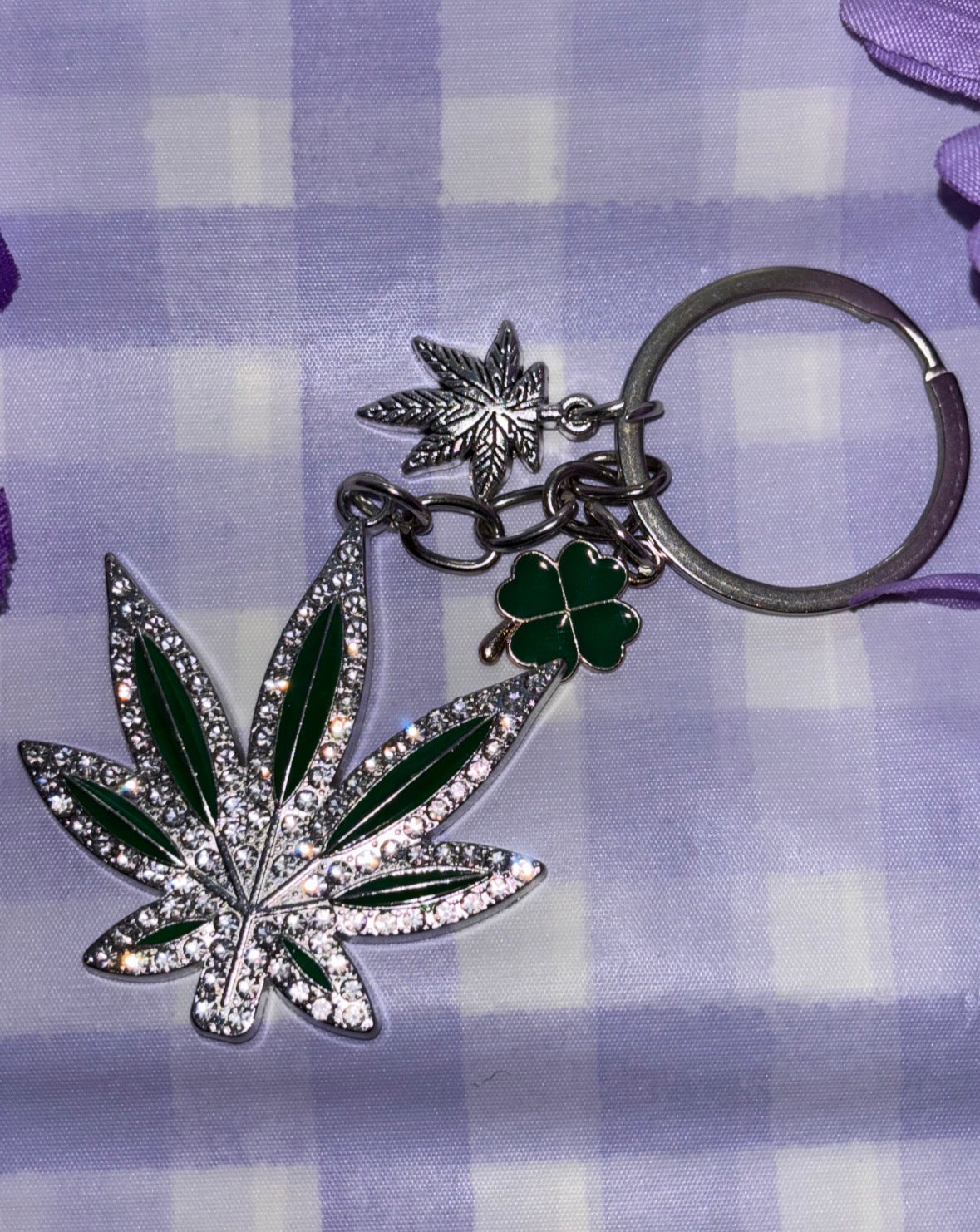 Add a little bling to your sesh. This silver rhinestone weed leaf keychain features emerald green accents and two cute charms, a four-leaf clover and a silver leaf for extra good vibes. Perfect for keys, bags, or stash box style.